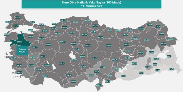 SAĞLIK Bakanı Faherettin Koca, 10-16 Nisan arasında 100 bin kişide görülen Kovid-19 vaka sayılarını açıkladı. Buna göre haftalık Covid-19 vaka sayısı, her 100 bin kişide Balıkesir'de 566.32'le yükseldi.