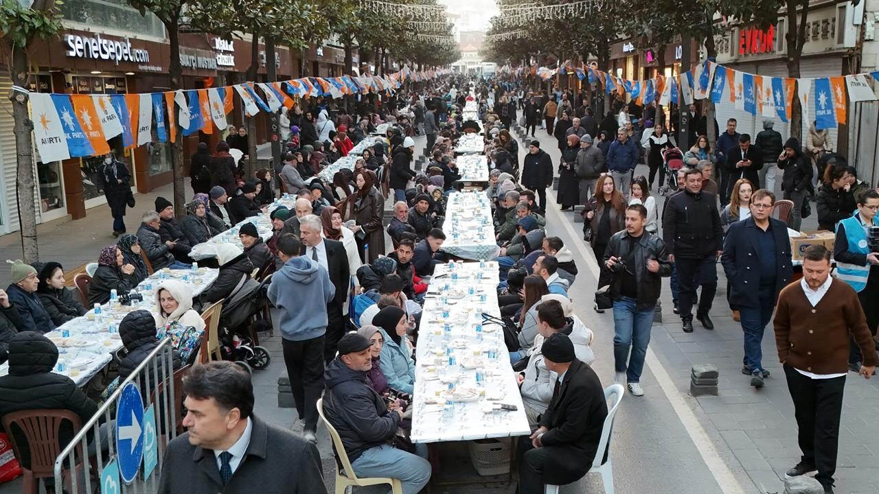 Ramazan ayının manevi atmosferi, Balıkesir’de kurulan dev iftar sofrasıyla taçlandı. Adalet ve Kalkınma Partisi Balıkesir İl Başkanlığı tarafından organize edilen programda, kentin en işlek noktalarından biri olan Millî Kuvvetler Caddesi boyunca kurulan uzun masalarda yaklaşık 10 bin vatandaş bir araya gelerek oruç açtı.